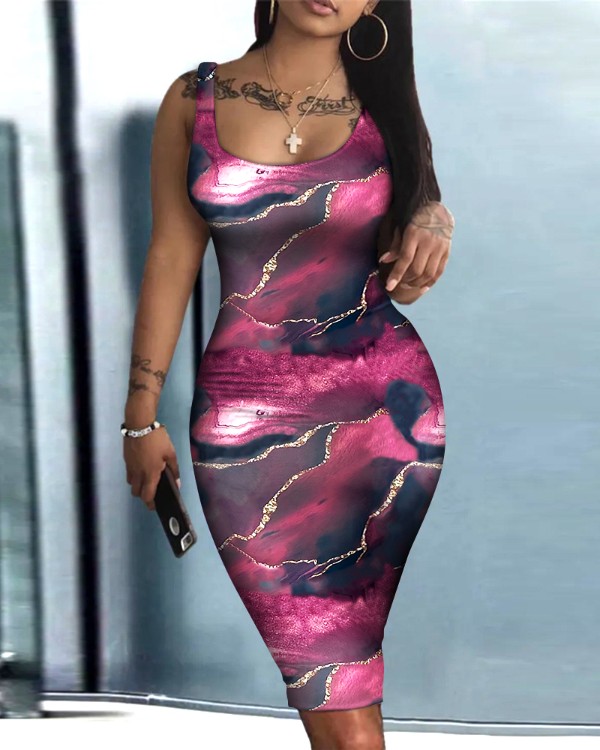 Marble Print Sleeveless UNeck Bodycon Dress